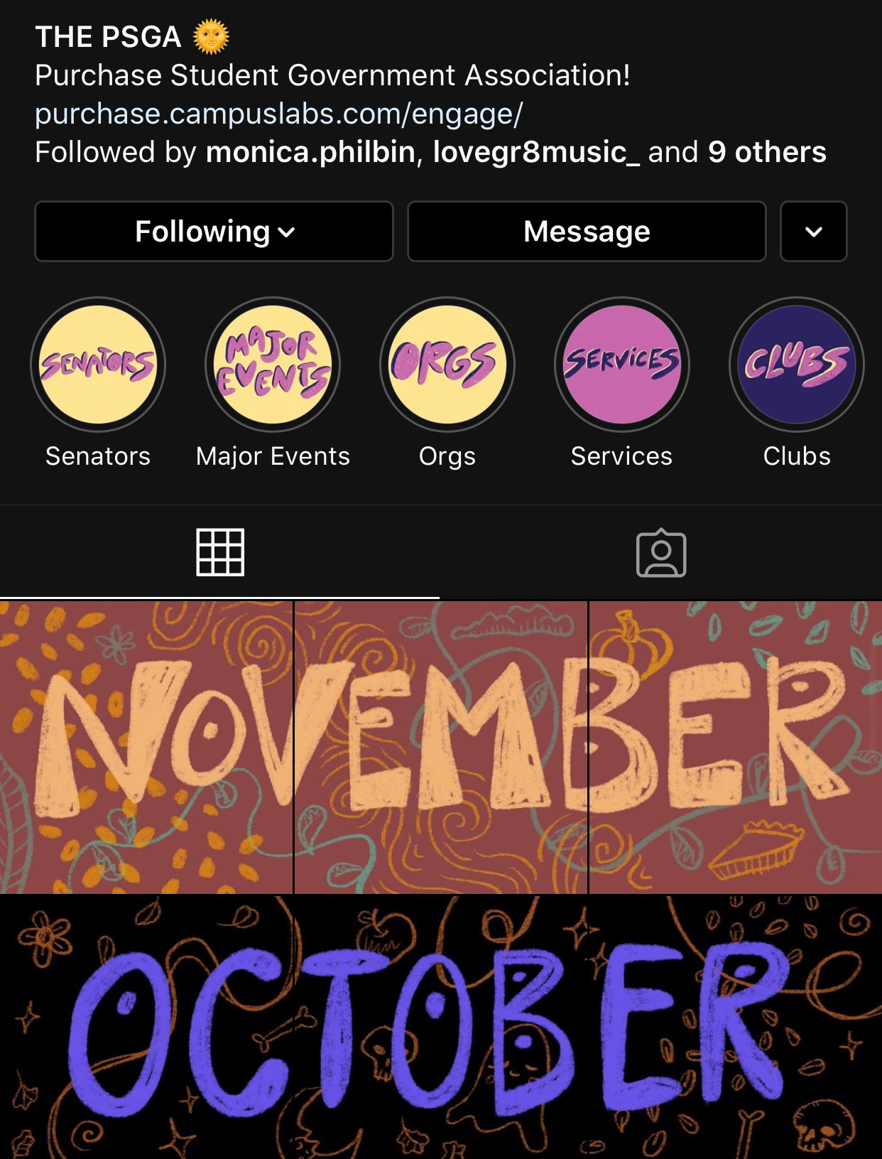 commissioned posters + instagram layout for the purchase college student government, fall 2019.
