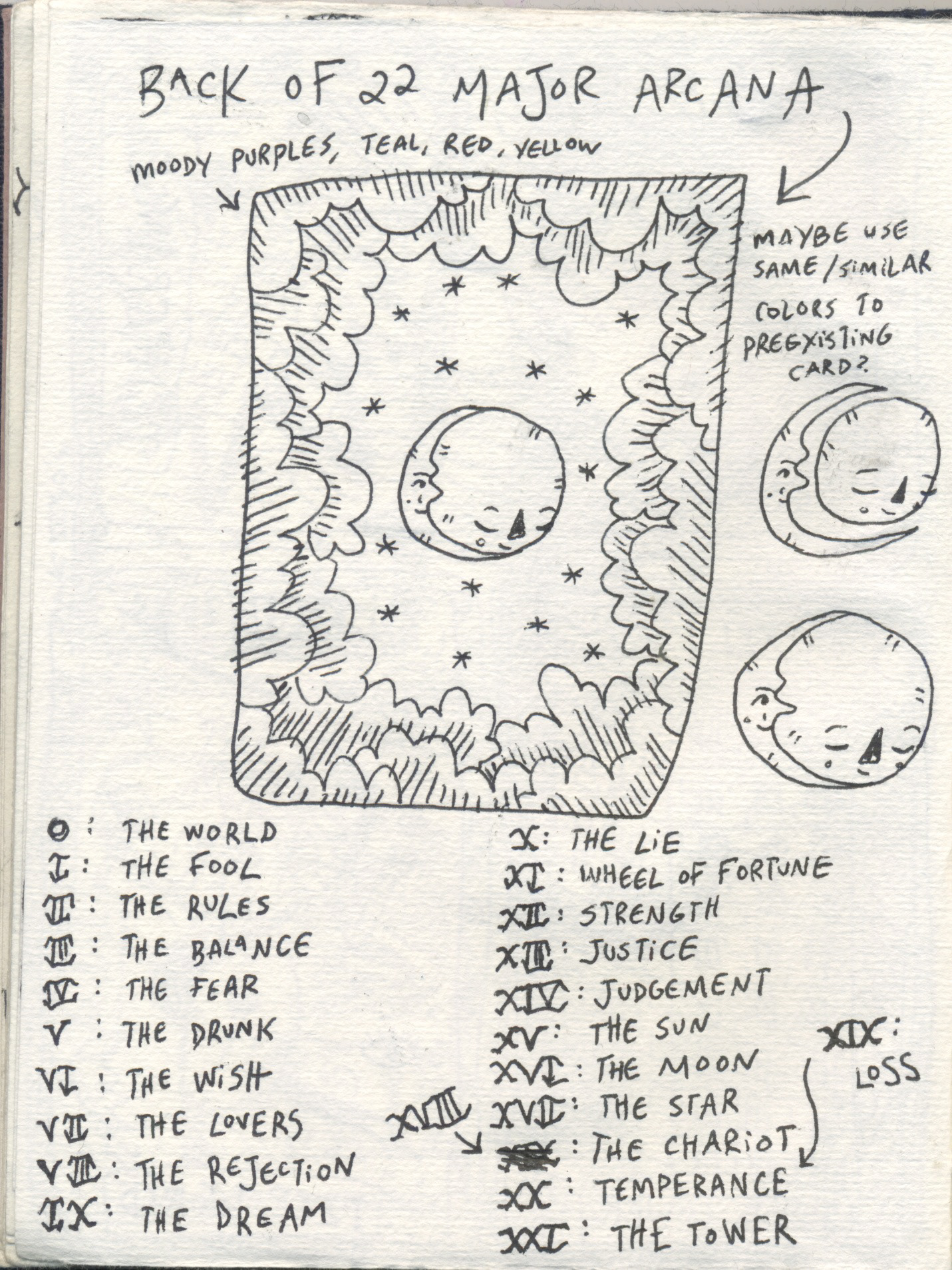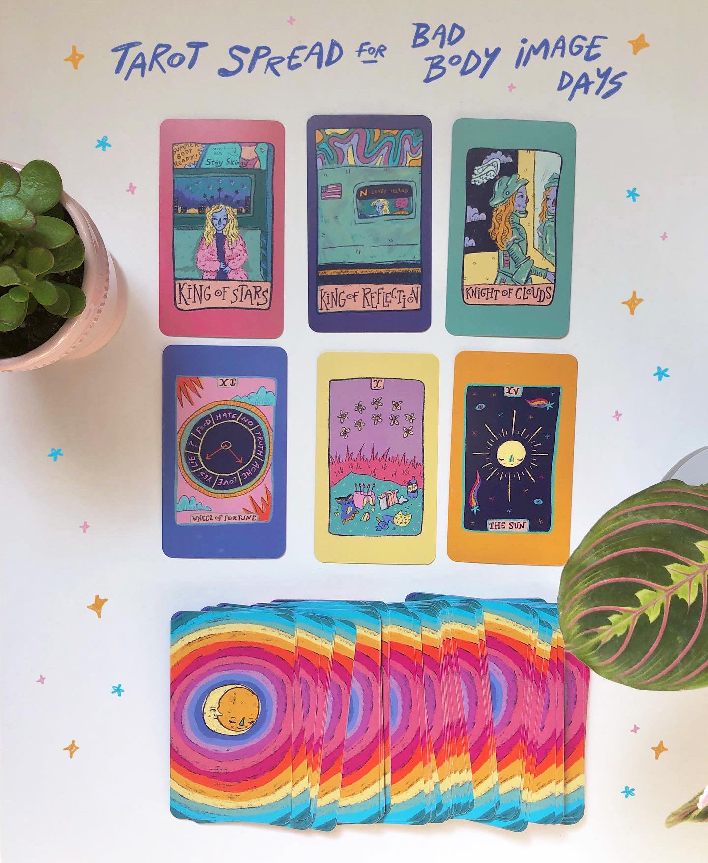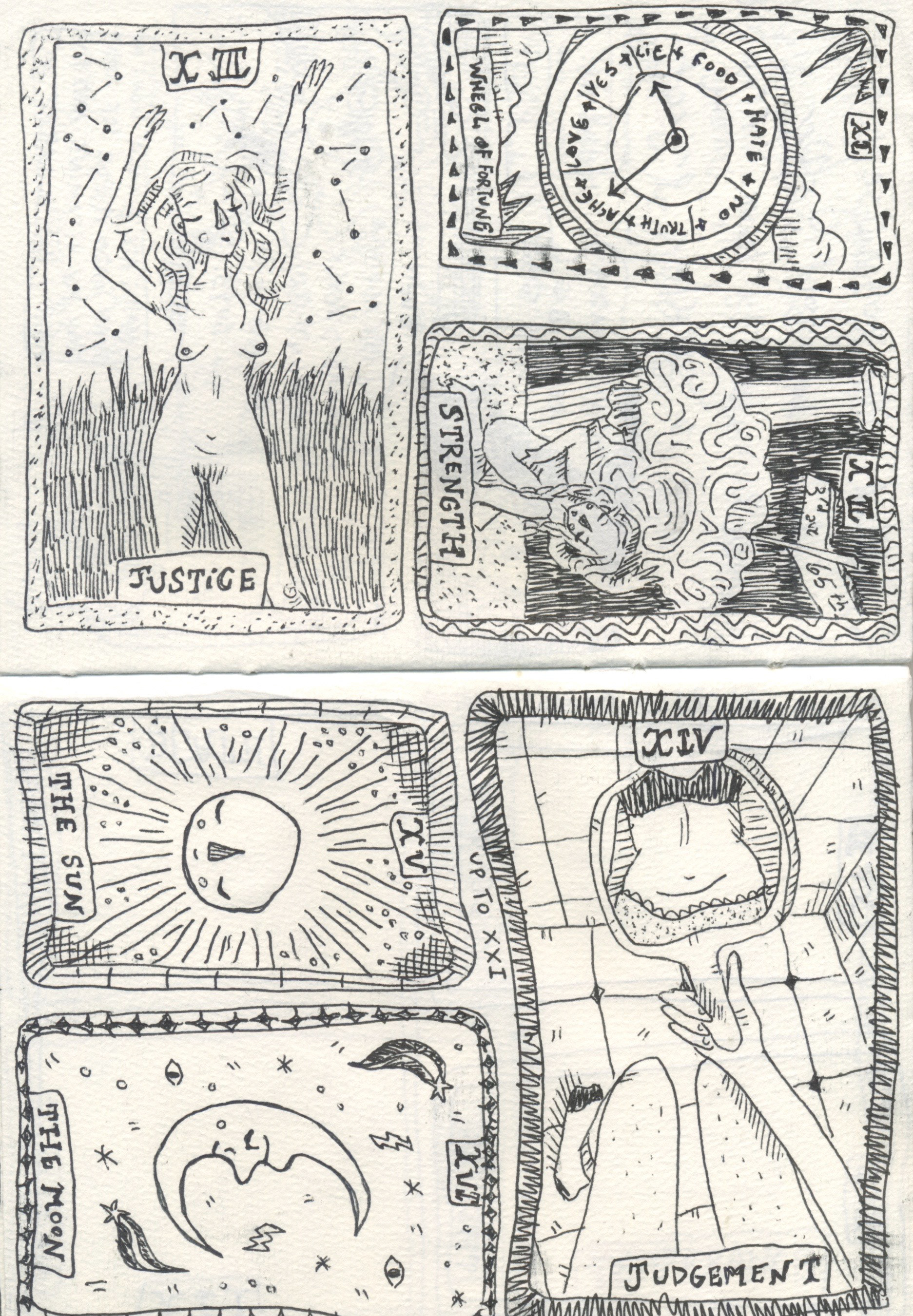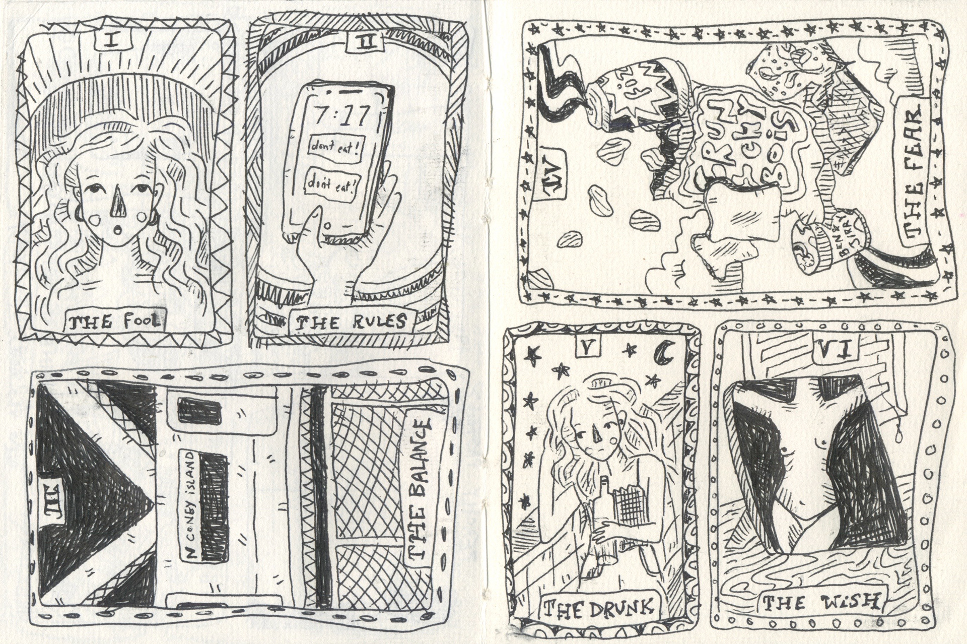 Initially created for my senior thesis, the Healing Tarot grew into something much larger. It is an atypical tarot deck that explores my journey through an eating disorder and navigating self acceptance. I created my own four suits (clouds, daisies, stars and reflection) while combining both traditional tarot imagery and my own illustrations + symbols.